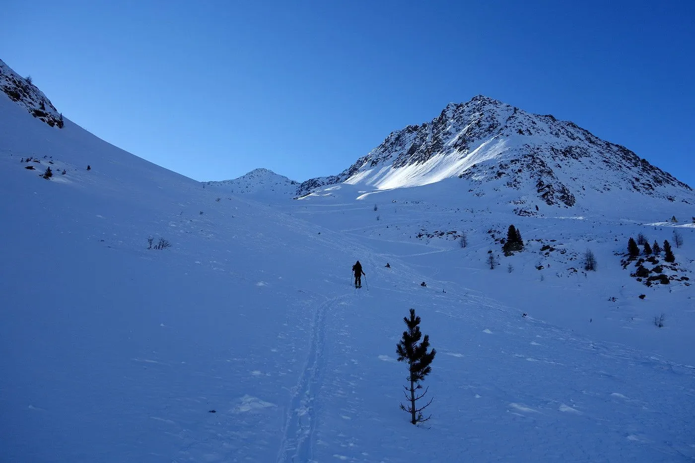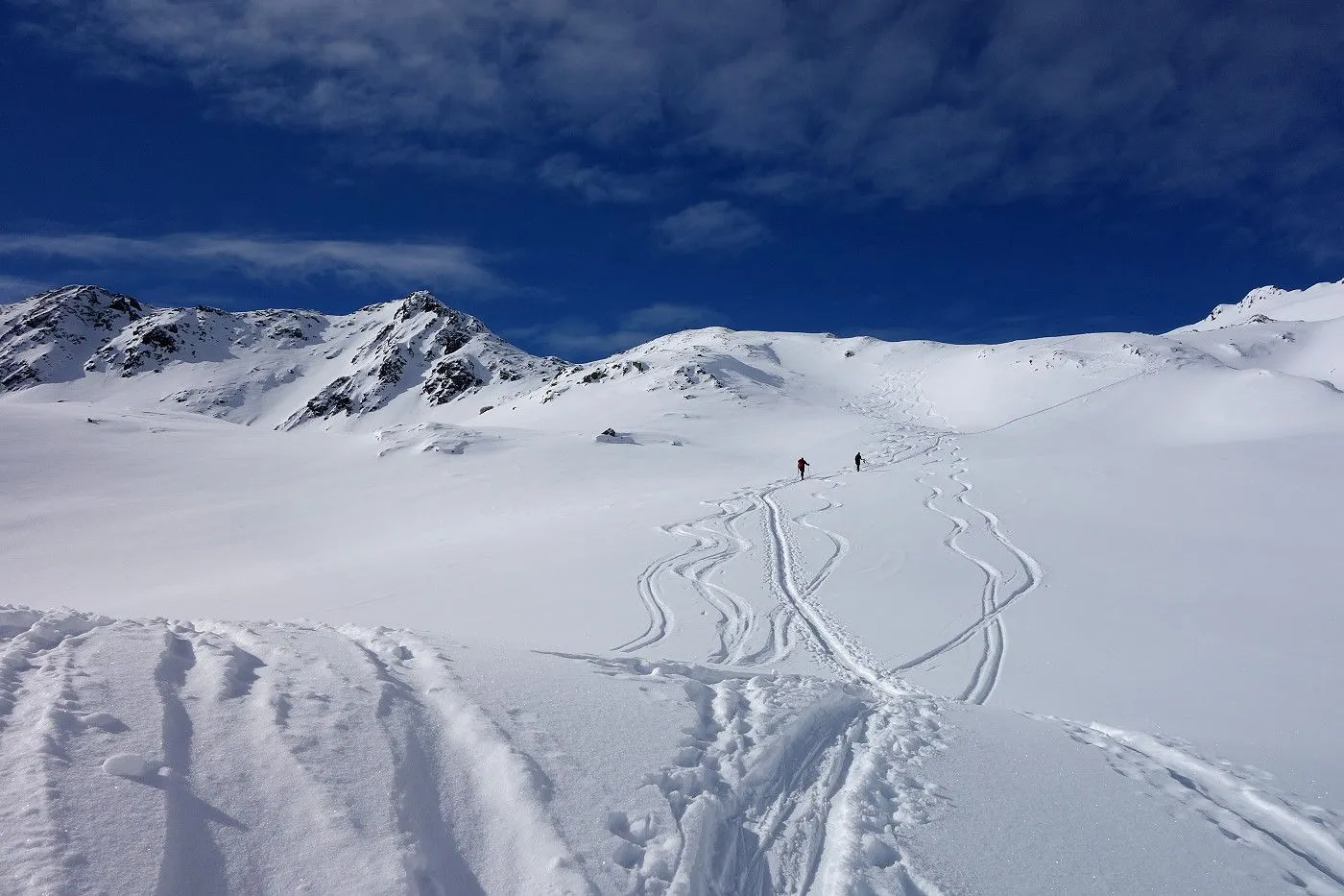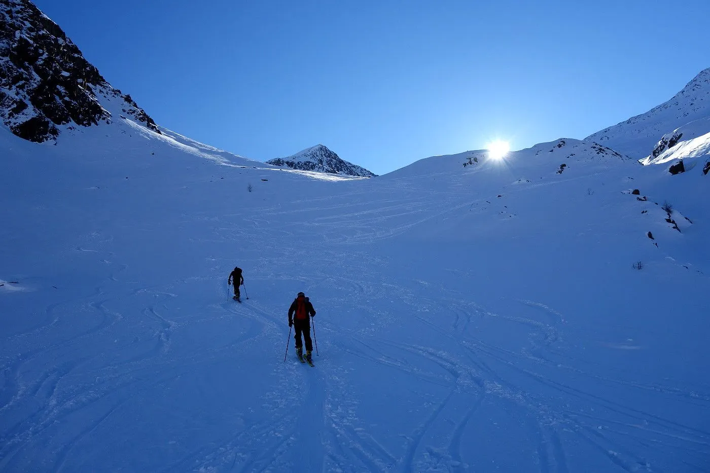 Die Abfahrt erfolgt zunächst in Anlehung zum Aufstieg. Auf Höhe 2570m hält man sich eher links und fährt über mäßig steile bzw. sogar sehr flache Hänge und Böden durch das Ackstal ab, bis man kurz vor dem Obersee auf die Langlaufloipe gelangt. Diese mehrmals querend abwärts bis zum Obersee und über die nichtgeräumte Passstraße mithilfe von Stockeinsatz und Skatingschritt zurück zum Ausgangspunkt.