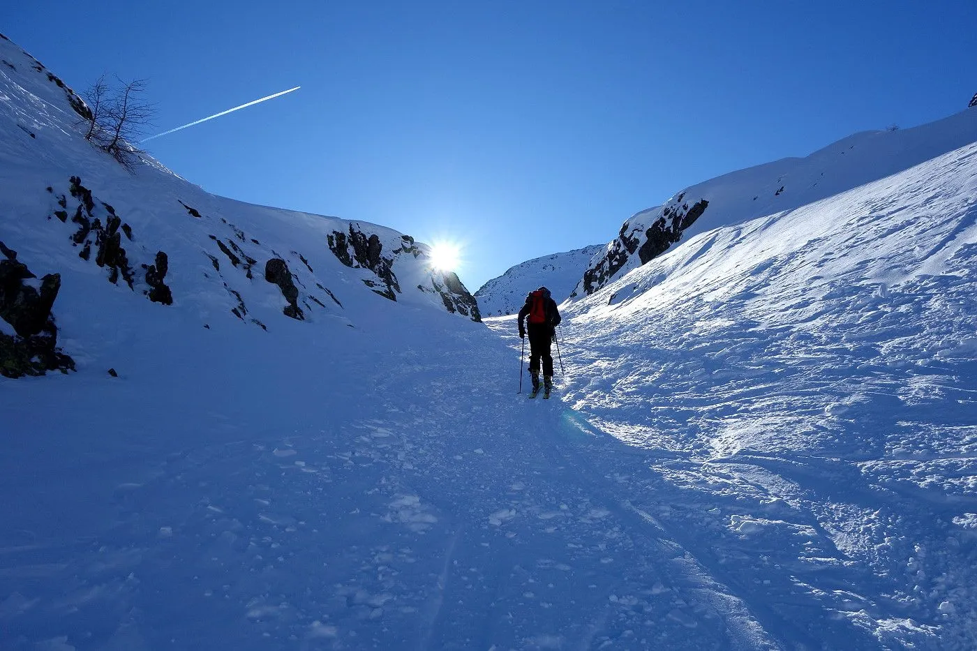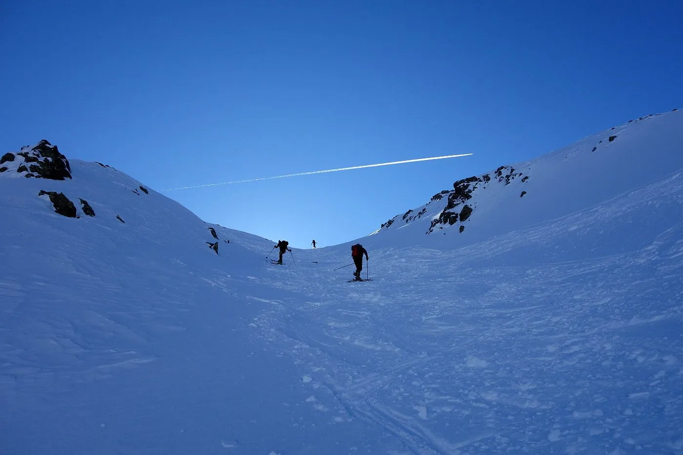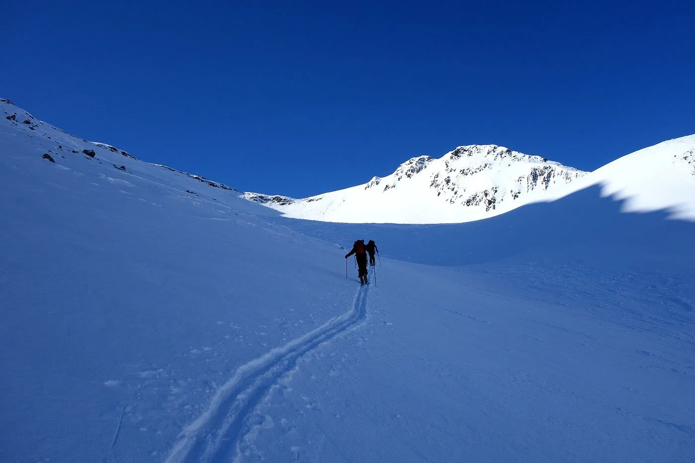 Die Abfahrt erfolgt zunächst in Anlehung zum Aufstieg. Auf Höhe 2570m hält man sich eher links und fährt über mäßig steile bzw. sogar sehr flache Hänge und Böden durch das Ackstal ab, bis man kurz vor dem Obersee auf die Langlaufloipe gelangt. Diese mehrmals querend abwärts bis zum Obersee und über die nichtgeräumte Passstraße mithilfe von Stockeinsatz und Skatingschritt zurück zum Ausgangspunkt.