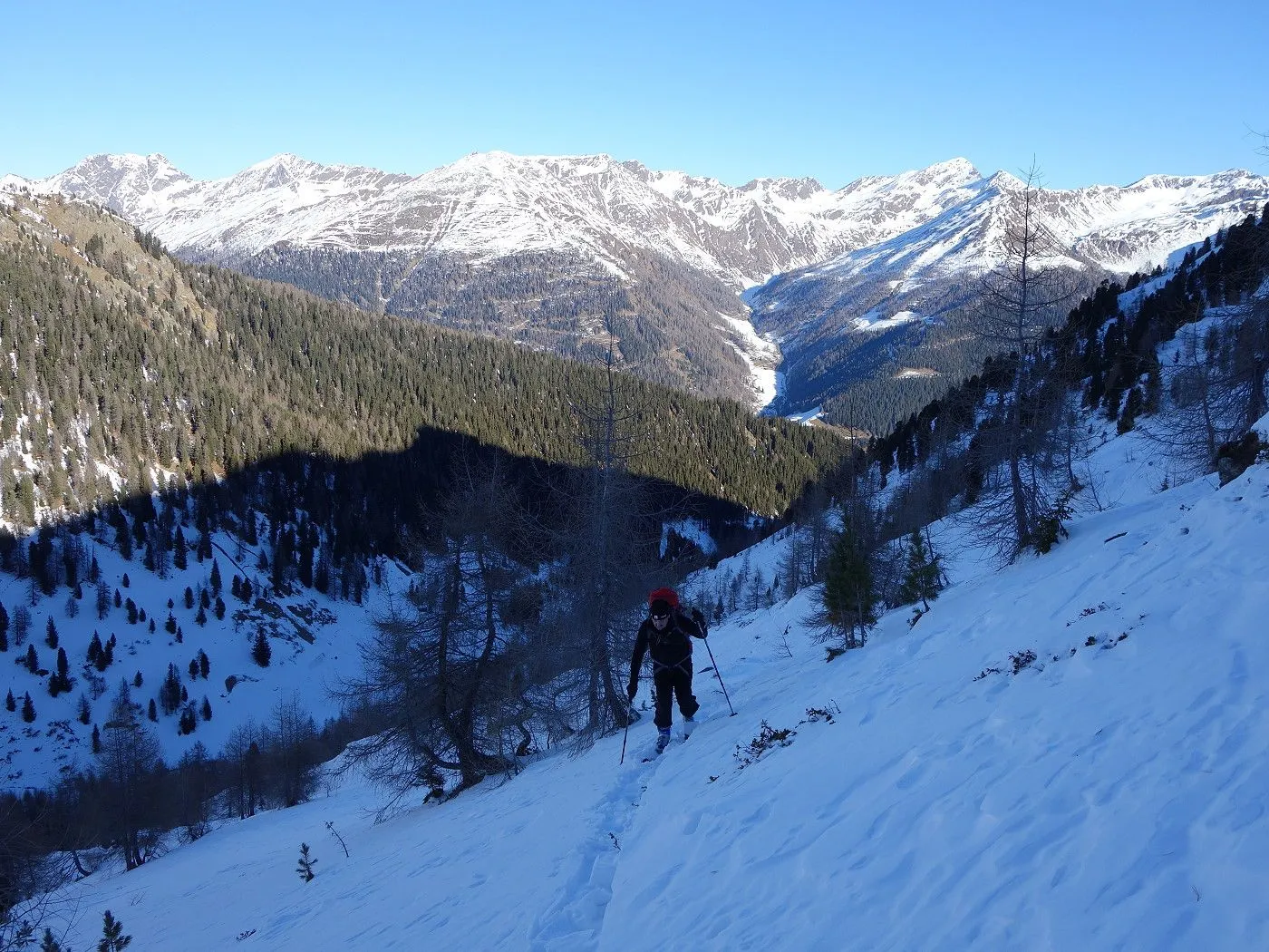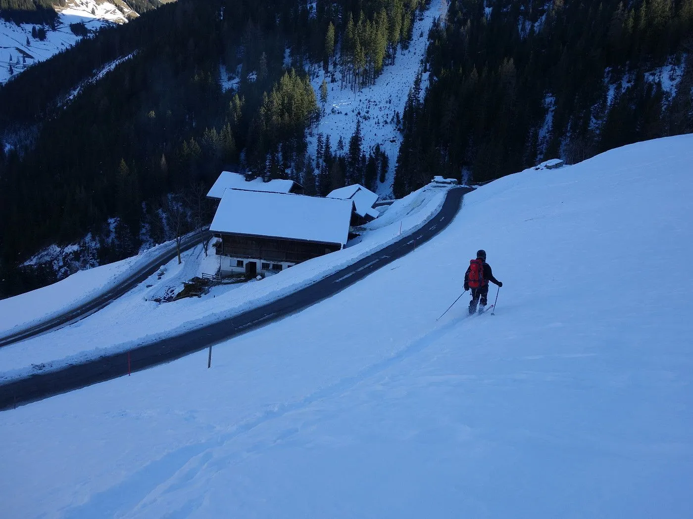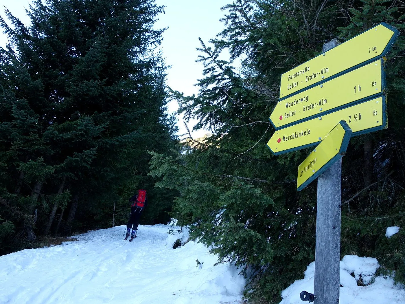 Technik: Mäßig anspruchsvoll; die Abfahrt über den schmalen Forstweg erfordert sicheres Skifahren. |