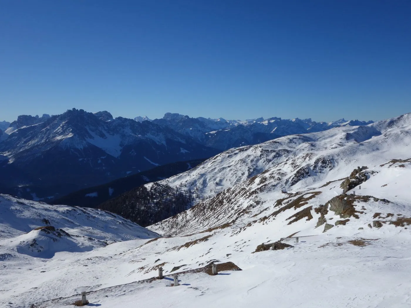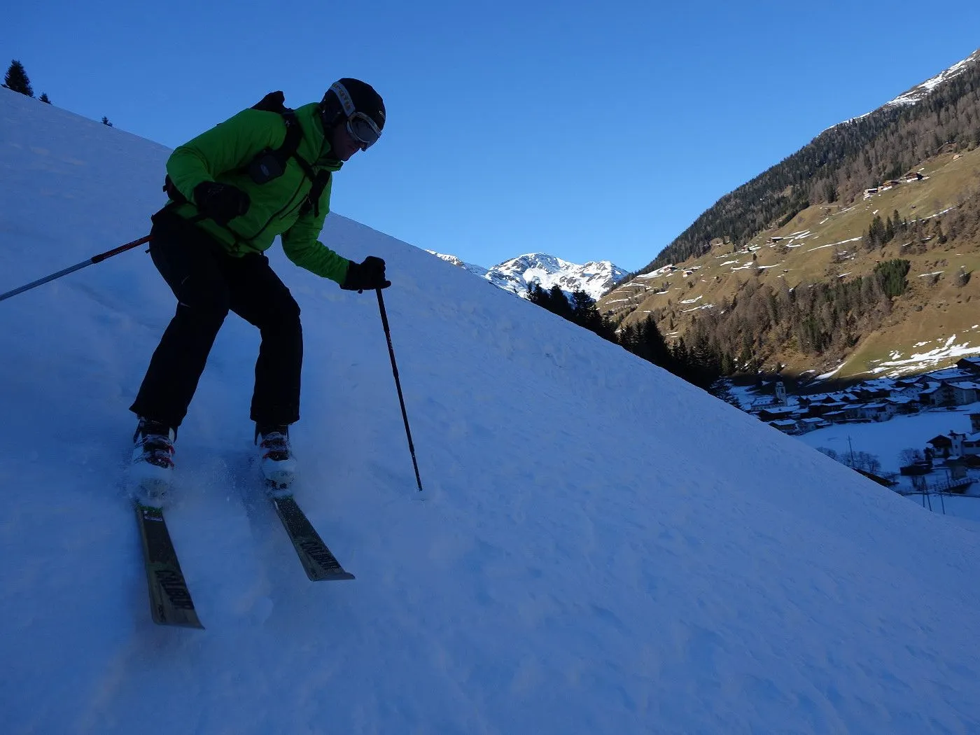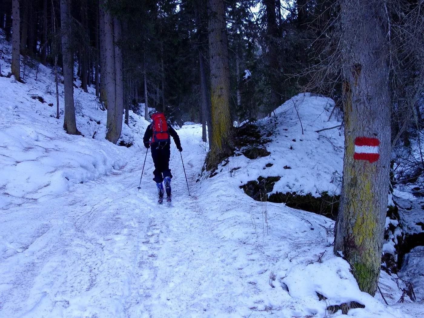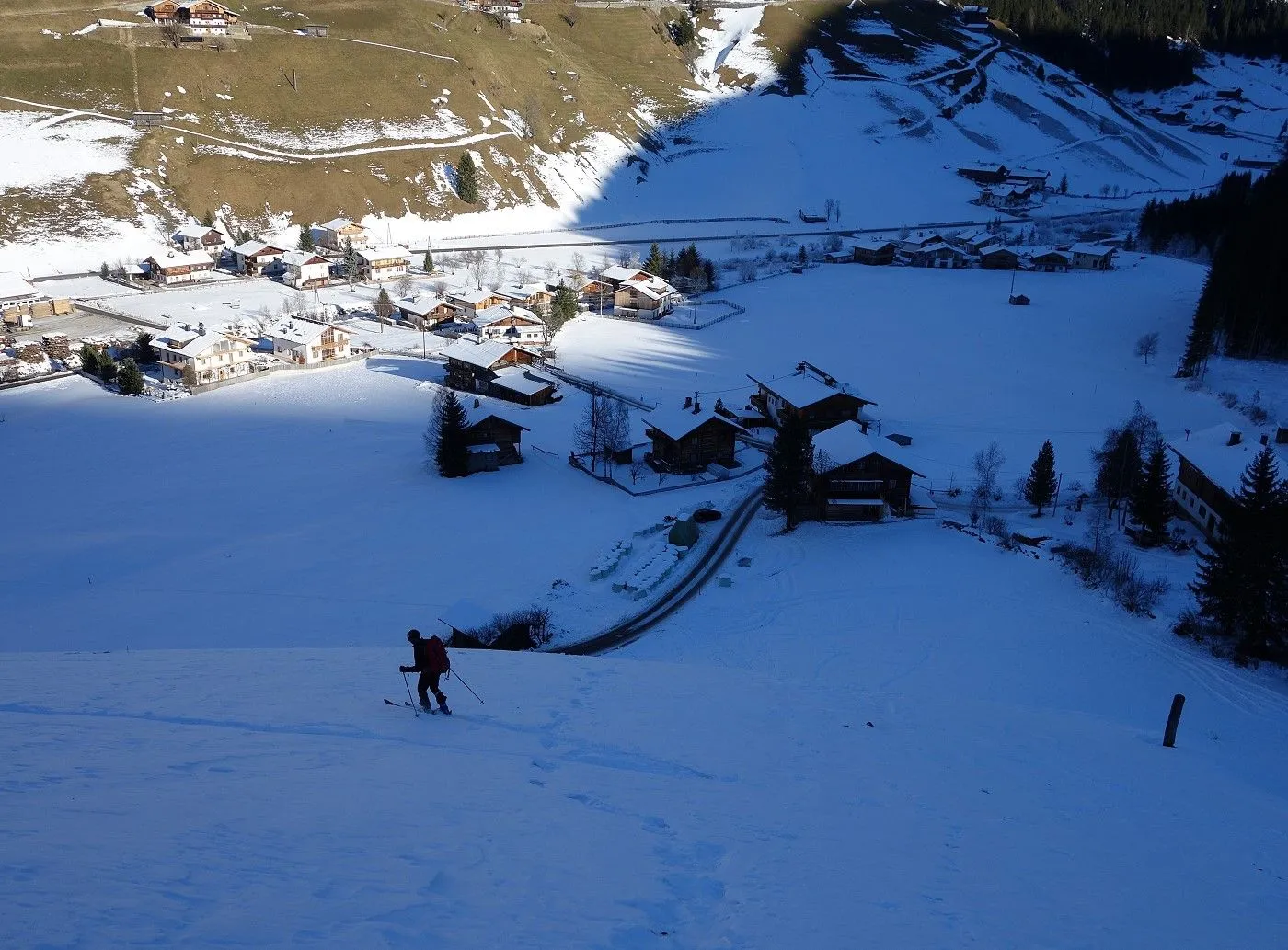 Technik: Mäßig anspruchsvoll; die Abfahrt über den schmalen Forstweg erfordert sicheres Skifahren. |