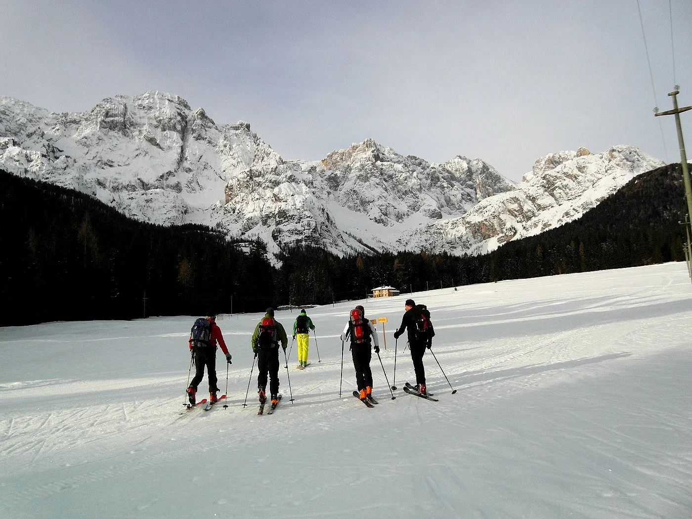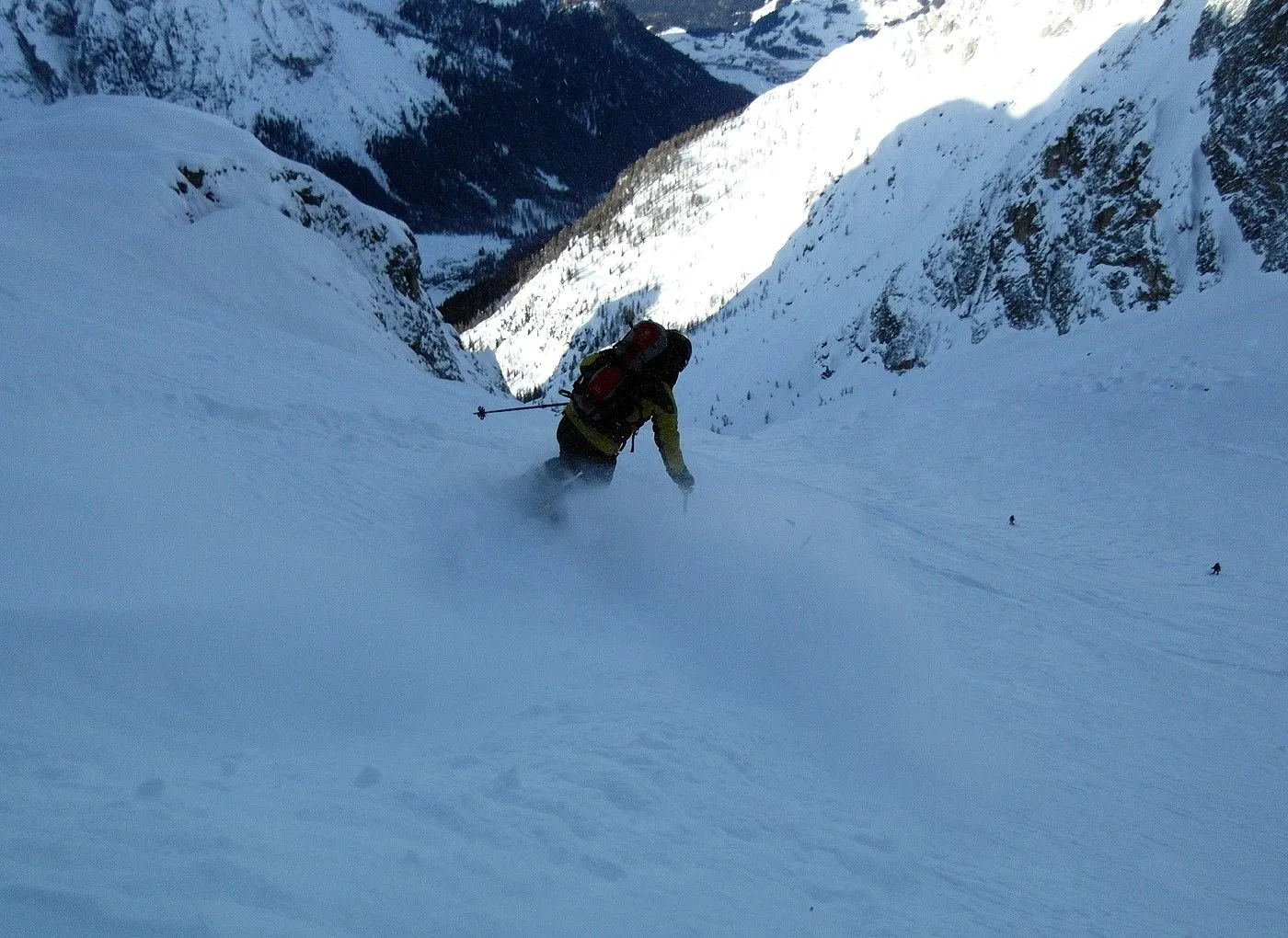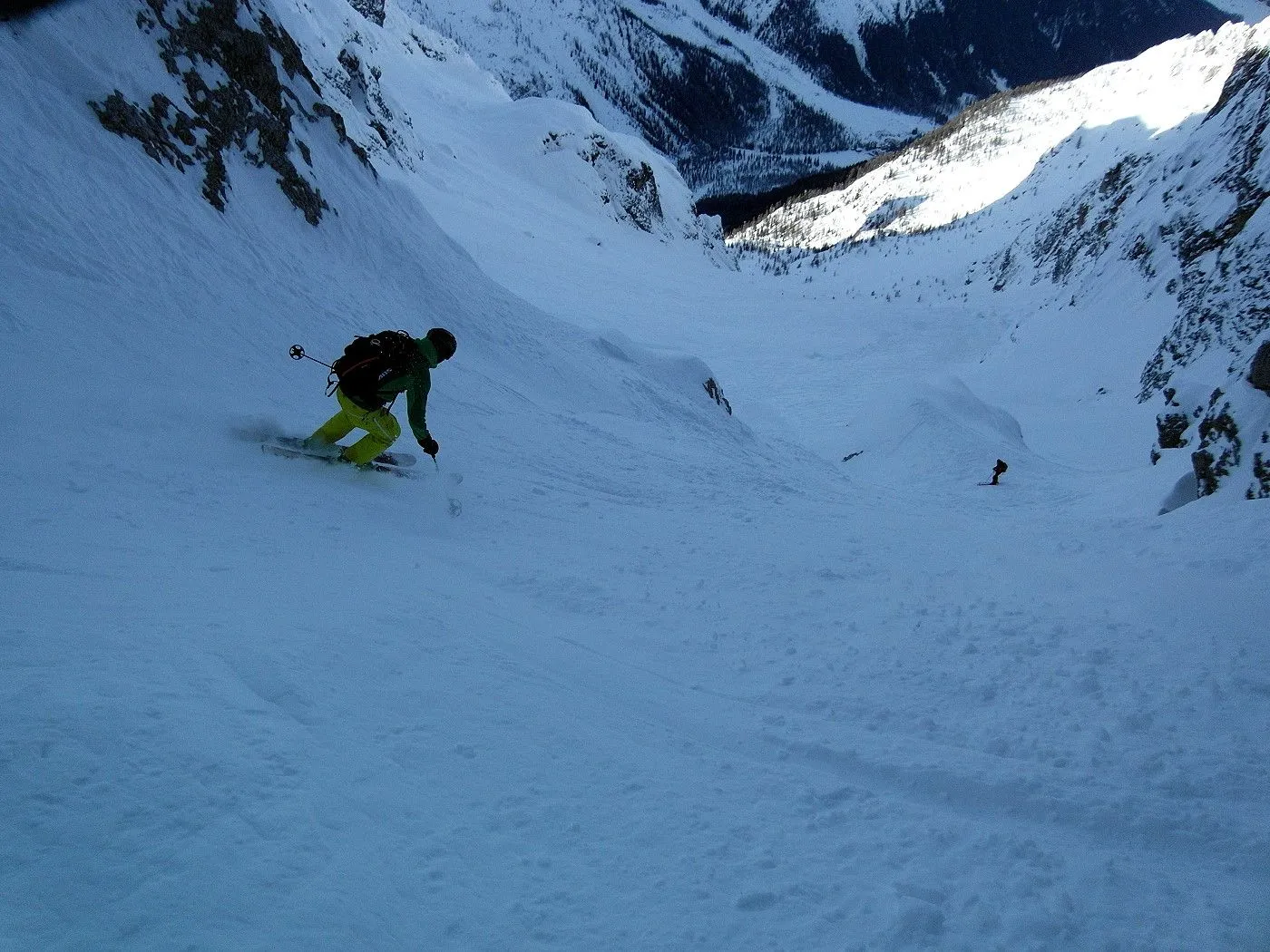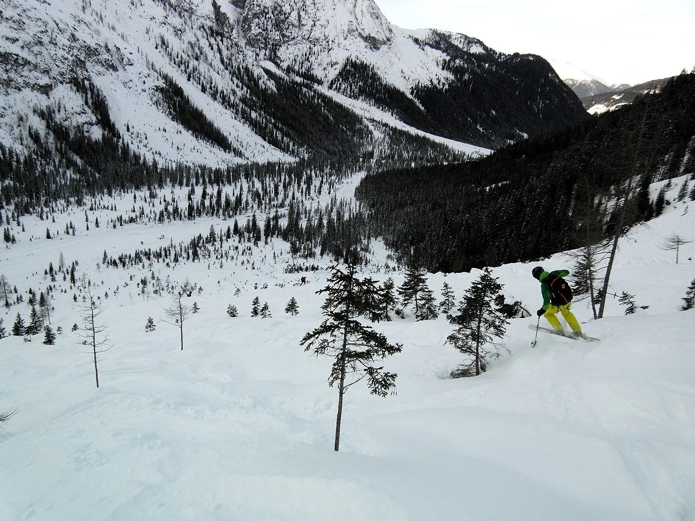 Bei dieser Variante wählten wir die Abfahrt Richtung Fischleintal, was natürlich ein zweites Auto voraussetzte, um wieder zum Ausgangsort zu gelangen. Zunächst fährt man eine sehr steile Rinne abwärts bis sich das Gelände deutlich weitet und man in einem breiten Becken die weitere Abfahrt über die Almereralm Richtung Fischleintal wählt. Dabei wechseln sich auch steile Passagen mit flacheren ab. Bei guten Bedingungen warten wunderbare Pulverhänge auf einen und man kann dauernd das wundervolle Bergpanorama der Sextner Dolomiten bestaunen. Am Ende der Abfahrt gelangt man auf eine Loipe, der man nordwärts, teilweise mithilfe des Stockeinsatzes, bis zum Dolomitenhof (1454m) folgt.