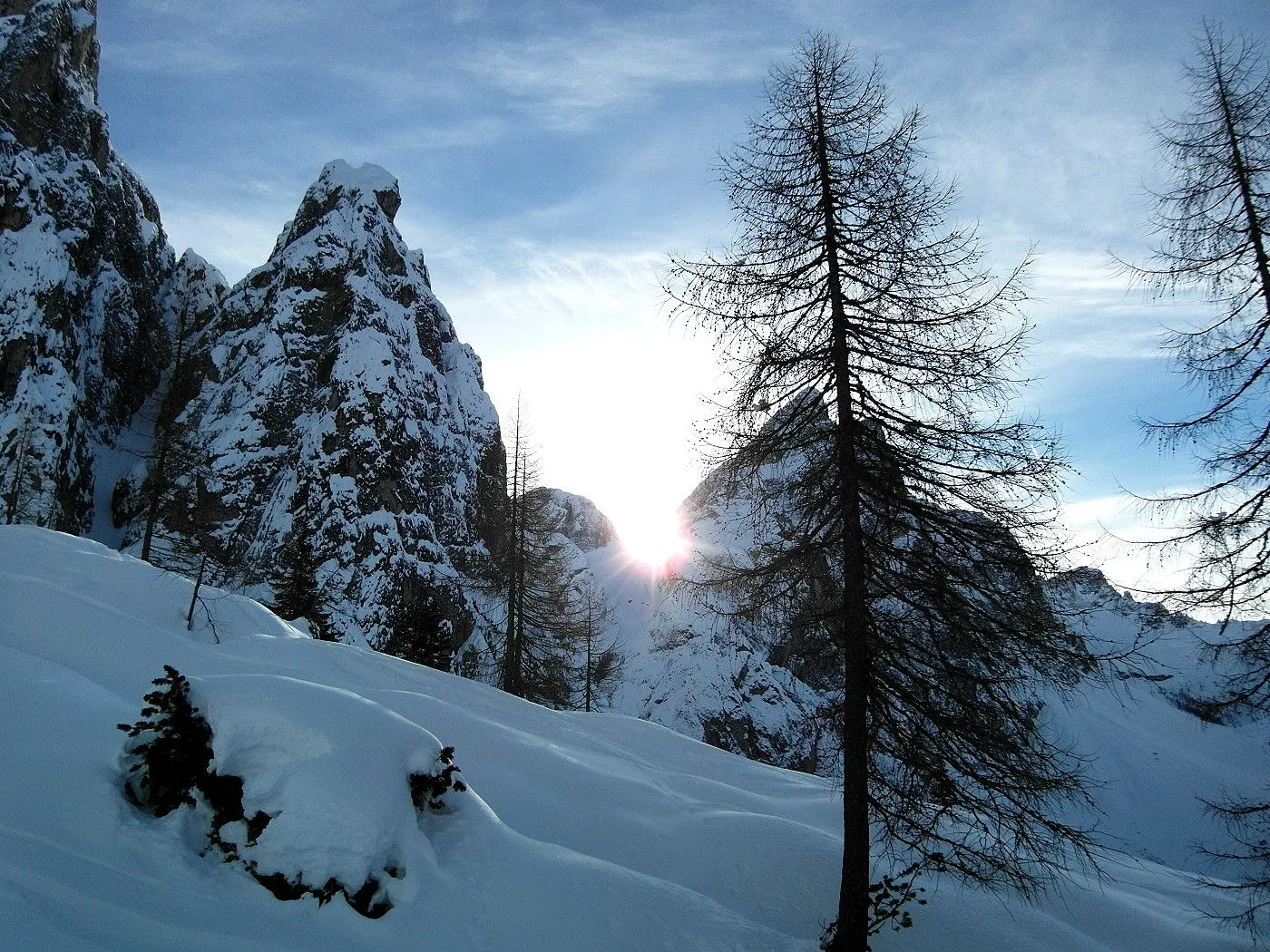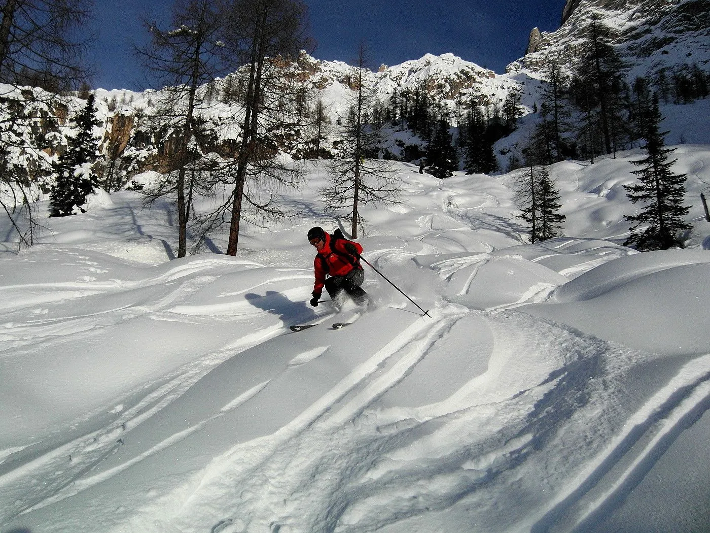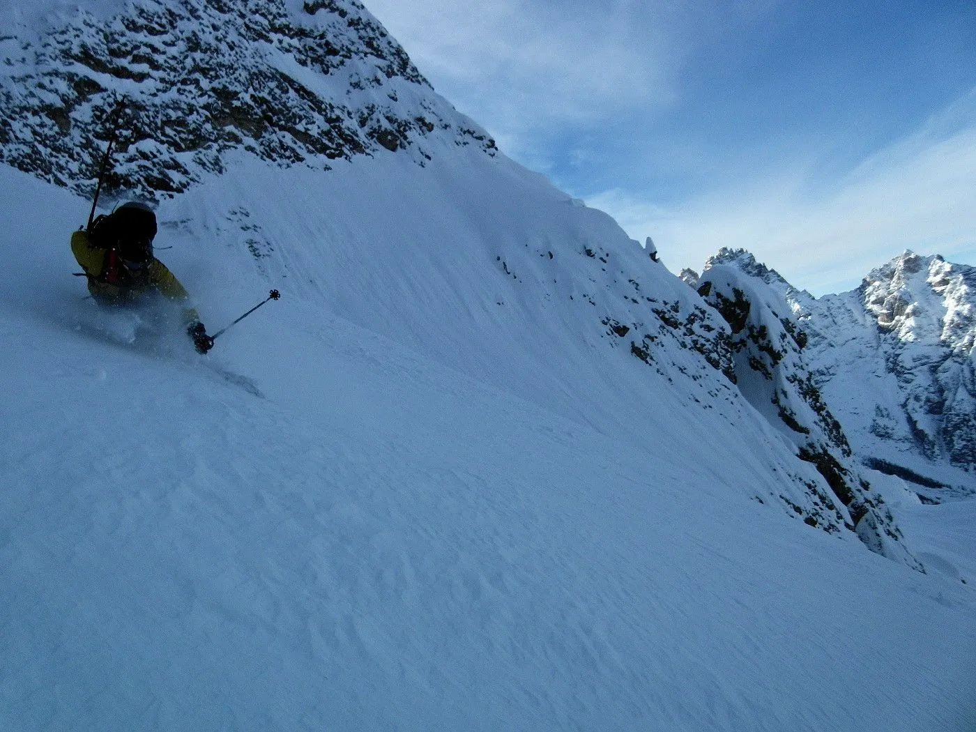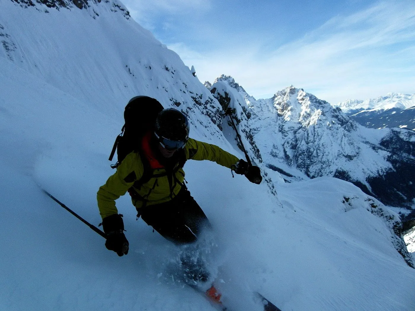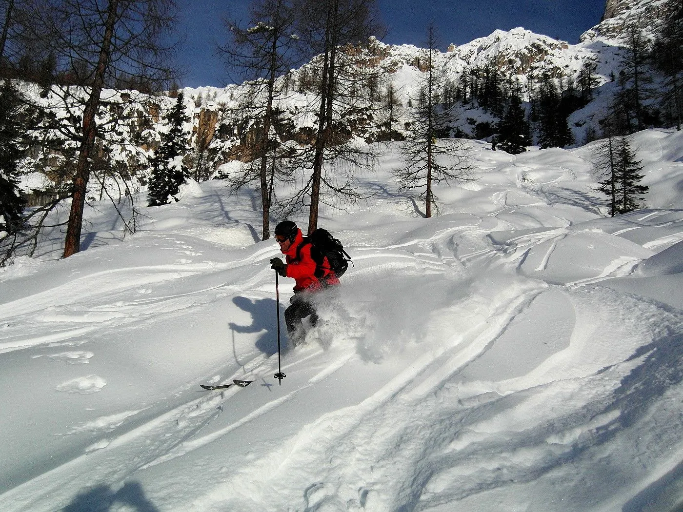 Bei dieser Variante wählten wir die Abfahrt Richtung Fischleintal, was natürlich ein zweites Auto voraussetzte, um wieder zum Ausgangsort zu gelangen. Zunächst fährt man eine sehr steile Rinne abwärts bis sich das Gelände deutlich weitet und man in einem breiten Becken die weitere Abfahrt über die Almereralm Richtung Fischleintal wählt. Dabei wechseln sich auch steile Passagen mit flacheren ab. Bei guten Bedingungen warten wunderbare Pulverhänge auf einen und man kann dauernd das wundervolle Bergpanorama der Sextner Dolomiten bestaunen. Am Ende der Abfahrt gelangt man auf eine Loipe, der man nordwärts, teilweise mithilfe des Stockeinsatzes, bis zum Dolomitenhof (1454m) folgt.