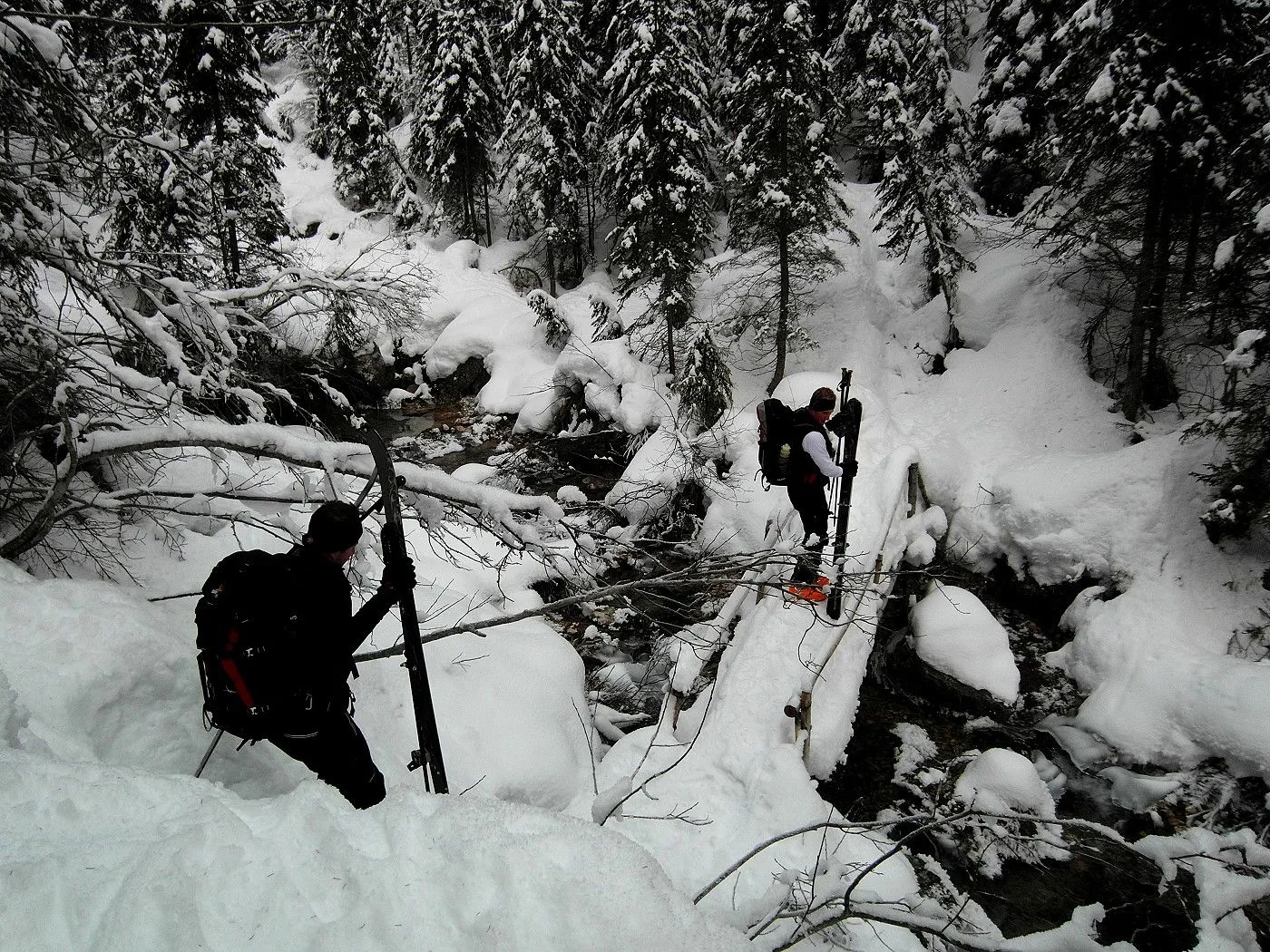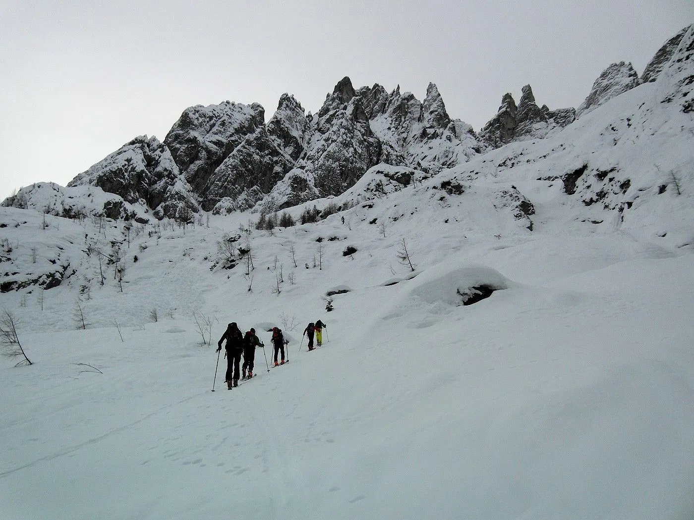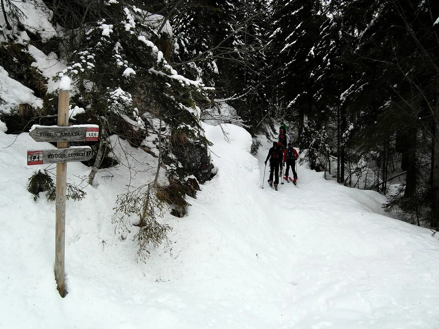 Die Skitour beginnt bei den Parkplätzen in Valgrande (1300m). Zunächst inwestlicher Richtung direkt über eine Wiese bis man auf eine Loipe trifft. Dieser weiterhin westwärts folgen, bis sie einen deutlichen Rechtsbogen macht. Nun verlässt man die Loipe und marschiert entlang eines Steiges, einige Male den Risenabach querend, recht mühevoll bis man das bewaldete Gebiet verlässt. Anmerkung: da die Strecke bis dorthin doch recht beschwerlich ist, könnte man alternativ von Valgrande entlang der Fahrstrasse über die Lunellihütte den Aufstieg bis dorthin wählen. Nun steilt sich das Gelände deutlich auf. Über eine sehr steile Geländestufe steigt man über einen schmalen Steig zur Bertihütte (1950m) hoch. Zu beachten ist hier die Lawinengefahr, da einige Lawinenkegel unseren Aufstieg säumten. Auch sollte man sicher auf dem Ski stehen, da teilweise Abrutschgefahr besteht. Bei der Bertihütte angekommen, kann man bereits das Tourenziel Sentinellascharte sehr gut erkennen. Der weitere Aufstieg erfolgt zunächst ziemlich in der Mitte des Poperatales, dann immer mehr an der linken Seite dessen. Zunächst recht flach, beginnt sich das Gelände später wieder deutlich anzusteilen. Am Ende muss man dann noch den recht steilen Schlussanstieg überwinden, den man mithilfe von zahlreichen Spitzkehren besteigt. Wenig später hat man dann das Tourenziel Sentinellascharte (2717m) erreicht.