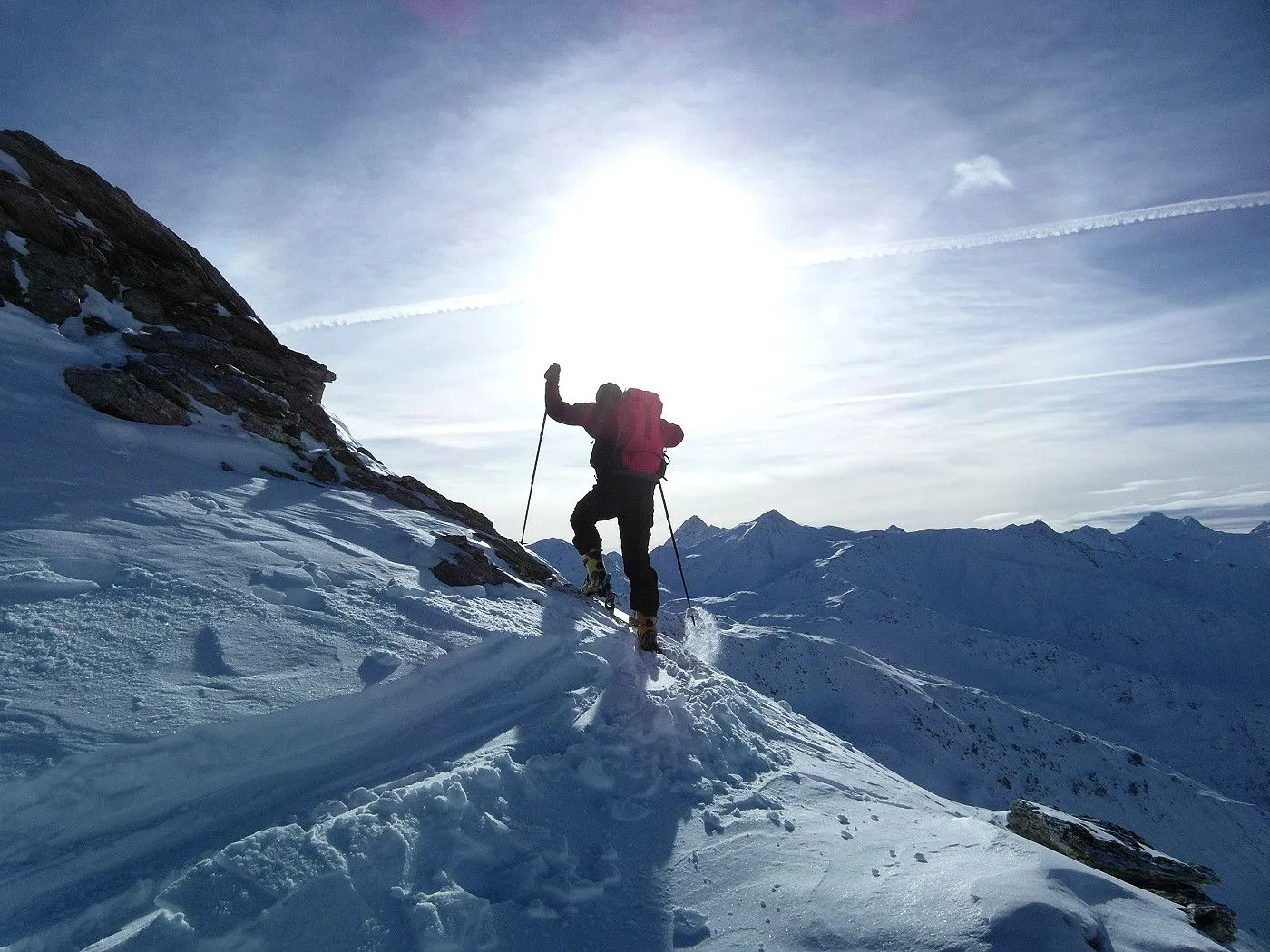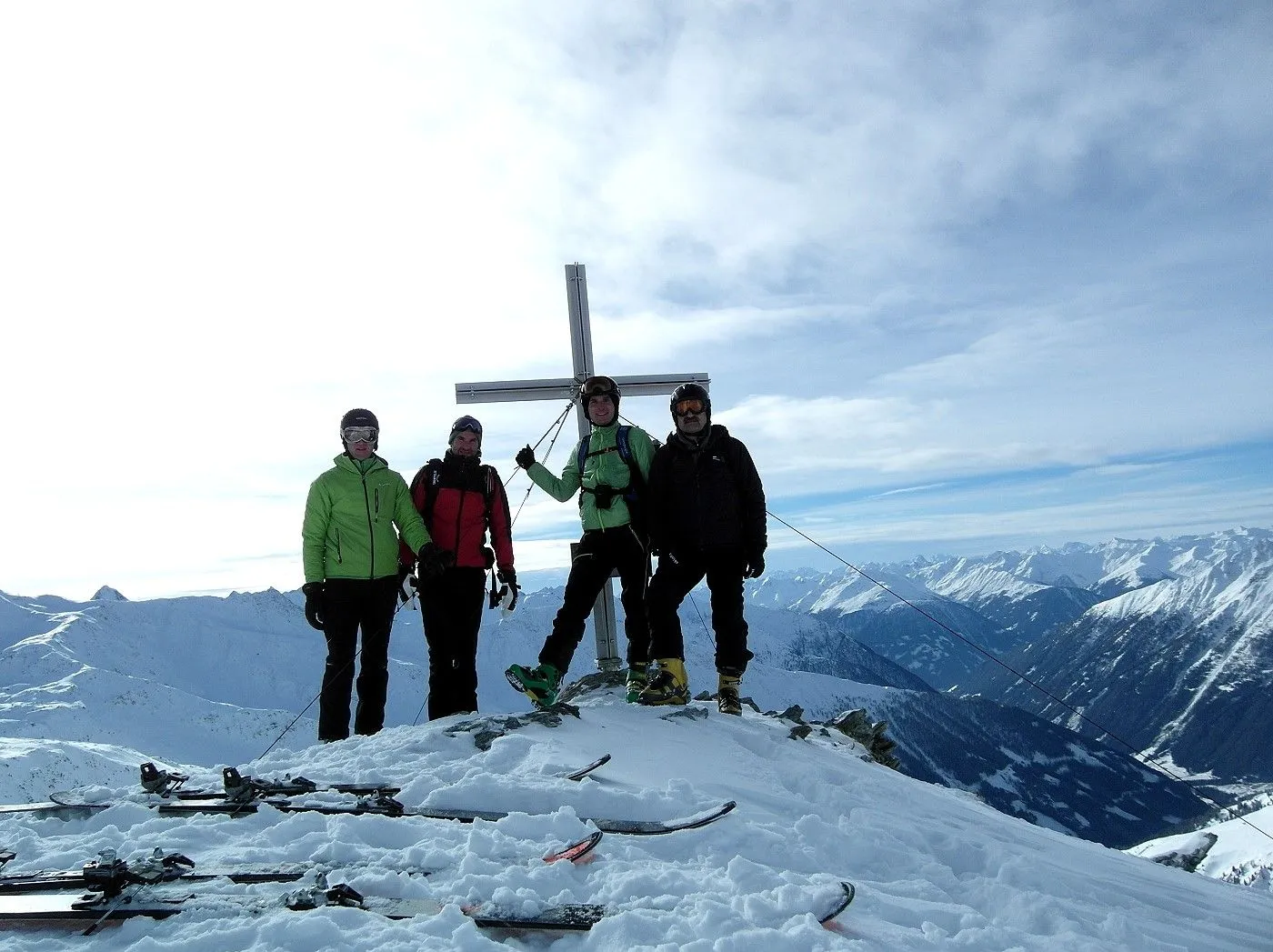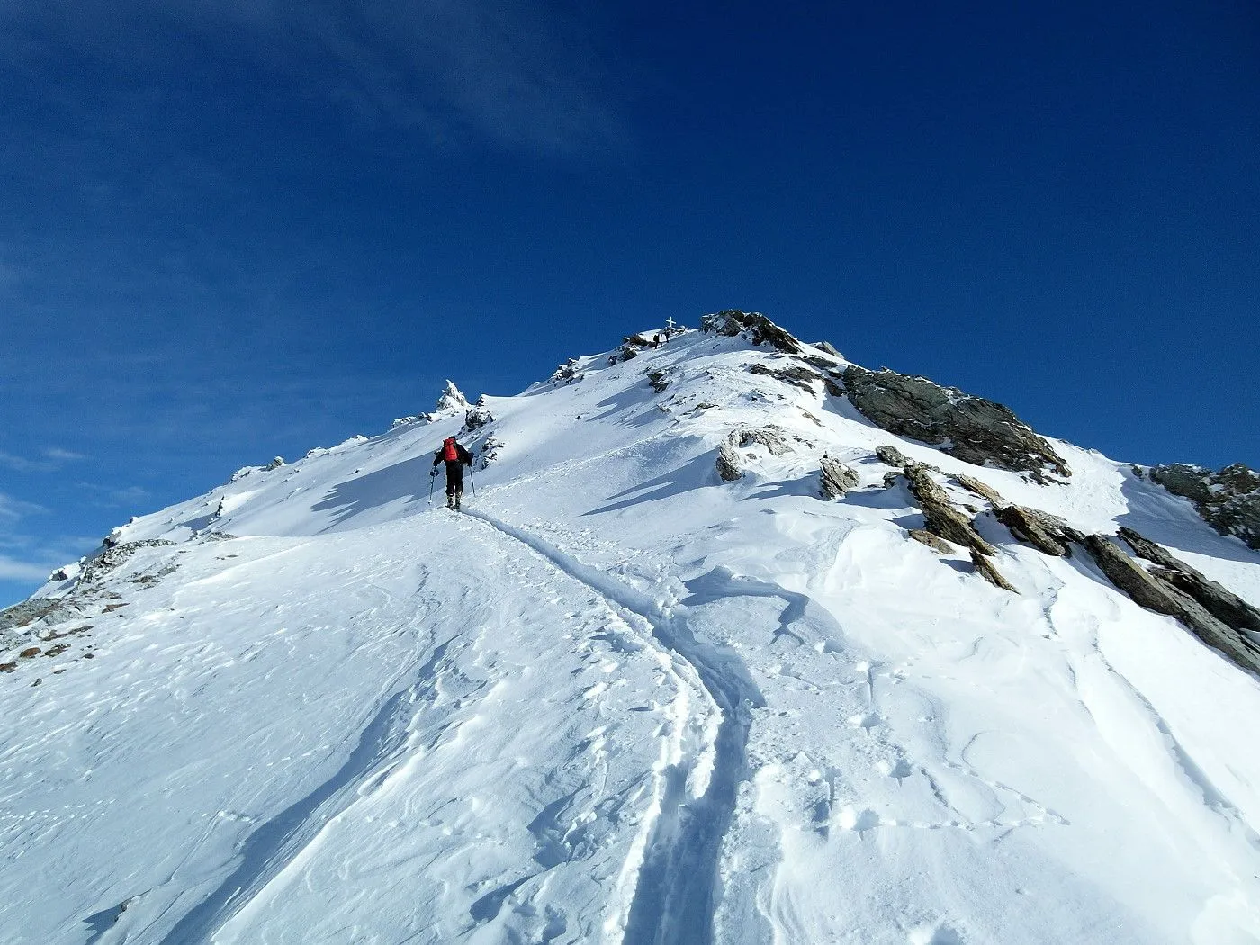 Normale Skitourenausrüstung, ggf. Steigeisen, falls der Gipfelgrat vereist ist.